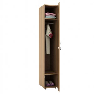 Mobile guardaroba/spogliatoio a 1 anta con serratura. in materiale melaminico classe e1 con finitura antigraffio e antiriflesso. diviso in 3 sezioni: un vano in alto e un vano in basso (dimensioni utili 29,4x50xh28cm) e un vano centrale (dimensioni utili 29,4x50xh118,8cm) completo di asta appendiabiti. dotato di fori per una perfetta aerazione posteriore e piedini regolabili in altezza.