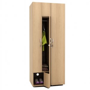 Spogliatoio a 2 ante ognuna con serratura. in melaminico classe e1 con finitura antigraffio e antiriflesso. ogni anta chiude un vano piccolo (dimensioni utili: 36,4x50xh28cm) e un vano grande (dimensioni utili: 17,3x 50xh118,8cm) completo di asta appendiabiti. dotato di fori per aerazione posteriore e piedini regolabili in altezza. le cerniere laterali sono provviste di un meccanismo scorrevole che permette l’apertura contemporanea del vano superiore con l'anta sx e del vano inferiore con l'anta dx.