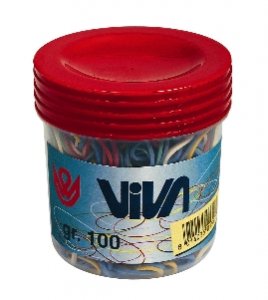 Barattolo da 100 grammi di elastici in gomma in misure assortite (da 30 mm a 120 mm). In colori assortiti. Barattolo con chiusura a vite.
