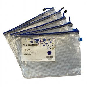 Busta starline in robusto pvc a rete con cerniera di colore blu. ideale per documenti e piccoli oggetti. formato utile: a4. formato esterno: 27x36cm.