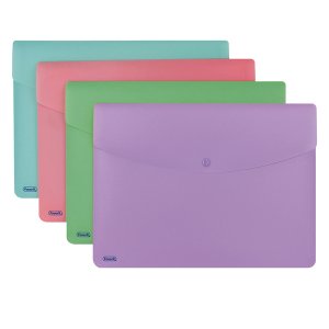 Realizzati in polipropilene opaco dai colori pastello. elevato spessore. chiusura con bottone a pressione colorato in tinta. indispensabili per proteggeree trasportare documenti. disponibili in 5 colori pastello: celeste, cipria, smeraldo, pesca e glicine. formato interno 21x29,7 cm.