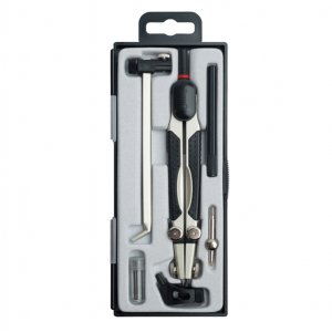 Scatola contenente: compasso universale, asta di prolunga stabile, attacco per compasso con innesto universale, tiralinee, supporto per tiralineee, tubetto di linee e ago di ricambio. cerchi fino a 520mm
