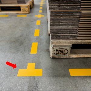 Segnaletica da terra per l'identificazione di aree pericolose, spazi di stoccaggio, passaggi pedonali ecc. resistenza allo scivolamento r9 e conforme alla normativa din 51130. simbolo autoadesive per applicazioni su pavimenti in ambienti interni. resistente all'abrasione. colore ral 1003 giallo.