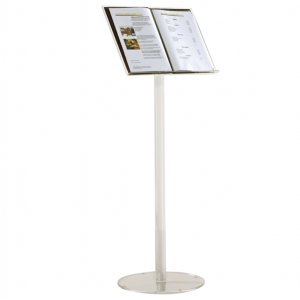 Elegante struttura in acrilico con base circolare e leggio 32x48cm. ideale per centri congressi, conferenze, ristoranti, teatri ecc. dimensioni: d36 x 122cm