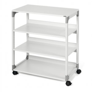 Struttura in acciaio verniciato con polveri epossipoliestere antigraffio e raccordi angolari in plastica resistente. dotato di quattro ripiani in melaminico spessore 19 mm e quattro ruote pivottanti di cui due provviste di dispositivo di bloccaggio. i due ripiani centrali sono regolabili in altezza. dimensioni: 879x750x432 mm (hxlxp)