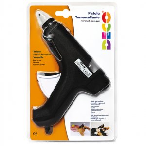 Pistola che consente di incollare oggetti di ogni tipo di materiale: cartone, stoffa, ceramica, legno, ferro, plastica, vetro, gomma ecc. alimentata a corrente.