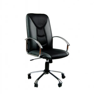 Poltrona direzionale con meccanismo di oscillazione con blocco. rivestimento in pelle, interno in spugna hr alta densita'. scocca in multistrato di legno di faggio, base a 5 razze in nylon diam. 620mm. braccioli cromati. sedile regolabile in altezza mediante pistone a gas (corsa 11cm). misure: h 106-117cm l 56cm (compreso braccioli) p 63cm. (h terra<->seduta 45-56cm). 15,5kg.