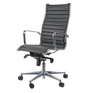 Poltrona con rete portante rivestita in pelle e trapuntata. schienale alto e base in acciaio. meccanismo oscillante con fulcro avanzato. braccioli in acciaio cromato e elevazione a gas.