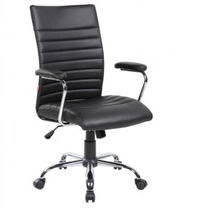 Poltrona a schienale medio rivestita in pu. braccioli e base in acciaio con ruote in nylon. meccanismo oscillante bloccabile. manopola per la regolazione di tensione della spinta. dimensioni cm l59 x p57 x h99,5-109