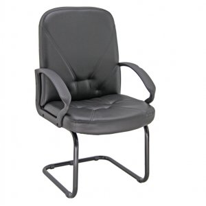 Poltrona in similpelle nera con schienale medio. braccioli in nylon e slitta in acciaio tubolare.