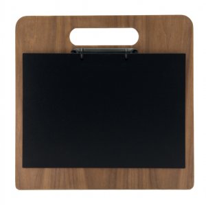 Porta menu' in legno a tagliere con 2 anelli in metallo laccato nero. completo con lavagnetta sottile nera scrivibile e utilizzabile come copertina del menu'. pennarello incluso. dimensioni: 32x24x0,5cm.