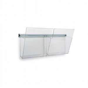Barra in alluminio con tappini terminali grigi. e tappi di fissaggio. completo di 2 tasche portadepliant vision a4 in polistirene trasparente neutro. dimensioni (lxhxp): 50x14x25cm.
