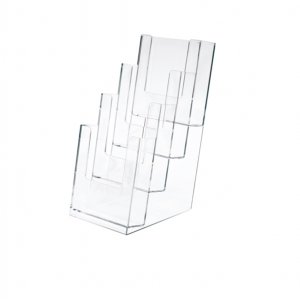 Portadepliant e portacataloghi in polistirolo trasparente antistatico e antiurto. formato: 11x24cm. profondita' 14cm. a 4 tasche