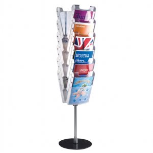 Espositore da terra con struttura in alluminio anodizzato e base in acciaio verniciato antracite. vaschette formato a4 in materiale plastico flessibile. frontalino amovibile per consentire una facile pulizia delle vaschette. dimensioni: d38 x 130cm - 12 tasche a4