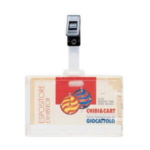 Portanome in pvc trasparente. apertura sul lato superiore. clip in plastica nera. non comprende il cartoncino. f.to esterno: 95x64mm. f.to interno: 90x60mm.