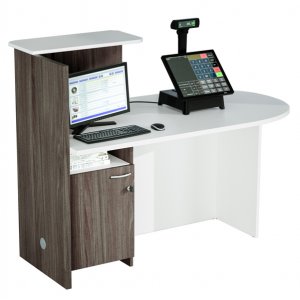 Reception ideale come postazione cassa in negozi, centri estetici ecc. o come reception in ambulatori, cliniche e ovunque sia necessaria una postazione di ricevimento confortevole ma compatta. dotata di bancone con piano sagomato 140x83xh73,3cm (sp. 25 mm). mensola superiore 62,8x32cm sp. 18mm (h42cm dal piano). due ripiani l38,2cm sotto il desktop sulla sinistra. fianco sinistro (sp. 25mm) con foro passacavi in corrispondenza del ripiano inferiore. bicolore bianco/frassino toscano.