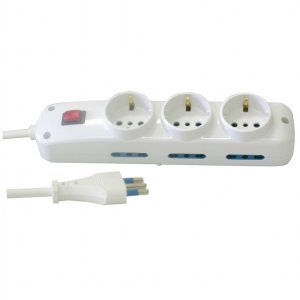 Presa multipla con interruttore luminoso, spina standard italiano 2p+t 16 a. cavo 1,5mt. tre prese frontali con alveoli schermati standard tedesco 2p+t laterale e centrale 16 a, tre prese a ricettivit multipla con alveoli schermati standard