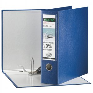 Resistente struttura in cartone da 2,4mm rivestito in polipropilene con finitura similpelle. innovativo meccanismo leitz 180 che consente una piu' ampia apertura degli anelli facilitando l'inserimento dei documenti. lapertura della leva a 180 rende possibile l'archiviazione dei fogli da entrambi i lati. solida custodia rivestita in cartagoffrata con grafica bicromatica. f.to utile (lxh 23x33cm) dorso 8cm