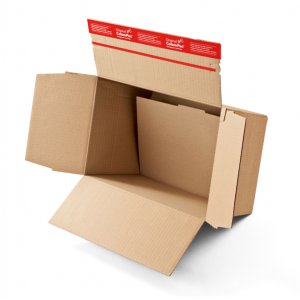 Scatola automontante con coperchio ad alette sovrapposte. chiusura autoadesiva senza l'utilizzo di nastro adesivo o graffette. altezza adattabile al contenuto grazie a delle scanalature da 50 a 115mm. fondo doppio. formato utile 229x164x50/115mm esterno 238x170x60/130mm