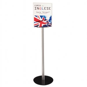 Supporto in alluminio per segnaletica da pavimento, con base in metallo verniciato nero e porta avvisi in metacrilato. dimensioni d32 x 130cm.