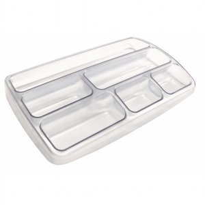 Bacinella portaoggetti dal formato compatto e di poco ingombro. puo' essere usanta all'interno di un cassetto o sulla scrivania. in plastica antiurto. dimensioni: 25,3x3,4x15,7cm.