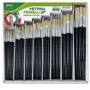 Vetrinette composta da 168 pennelli in pura setola punta spatola assortiti: 36pz x n 0/2 - 24pz x n 4/6 - 12pz x n 8/10/12 - 6pz x n 14-/16
